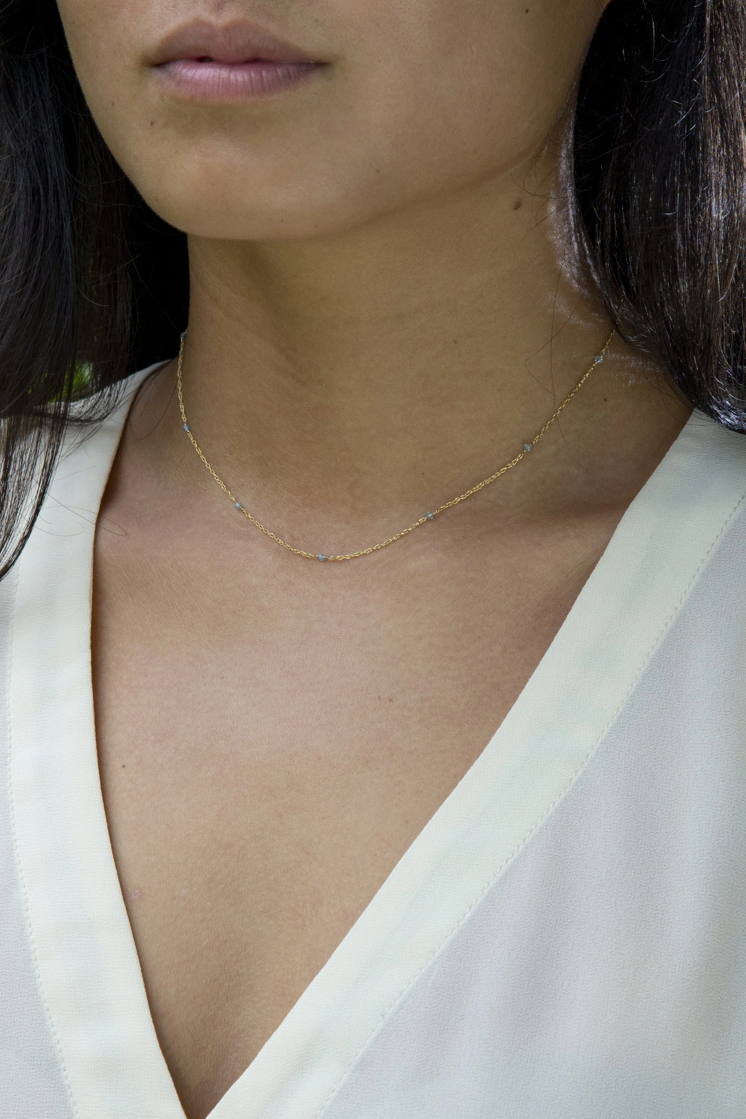 A delicate rope chain dotted in bright blue beads, a little party on your neck. Perfect for layering and a simple answer to the everyday piece.